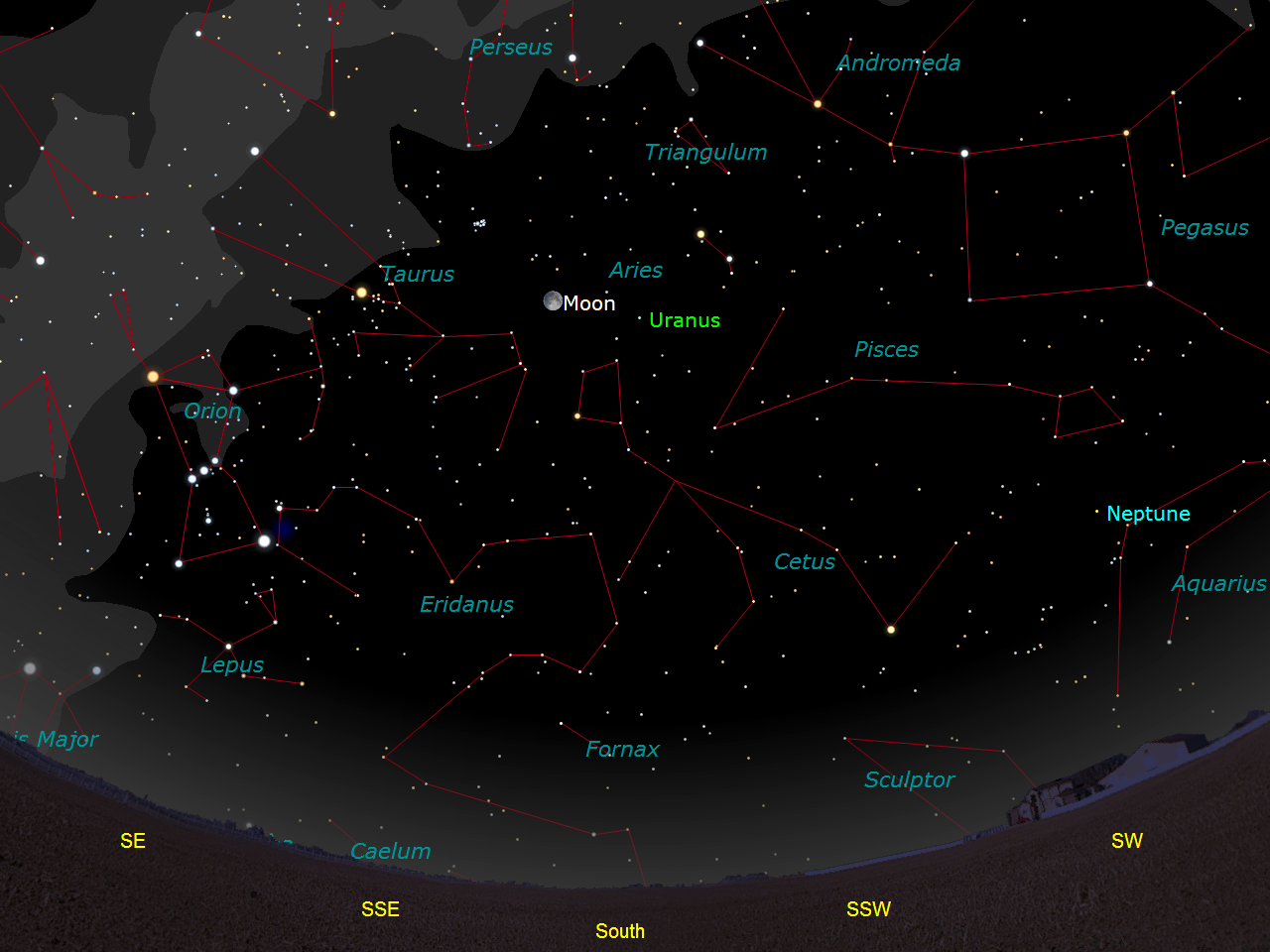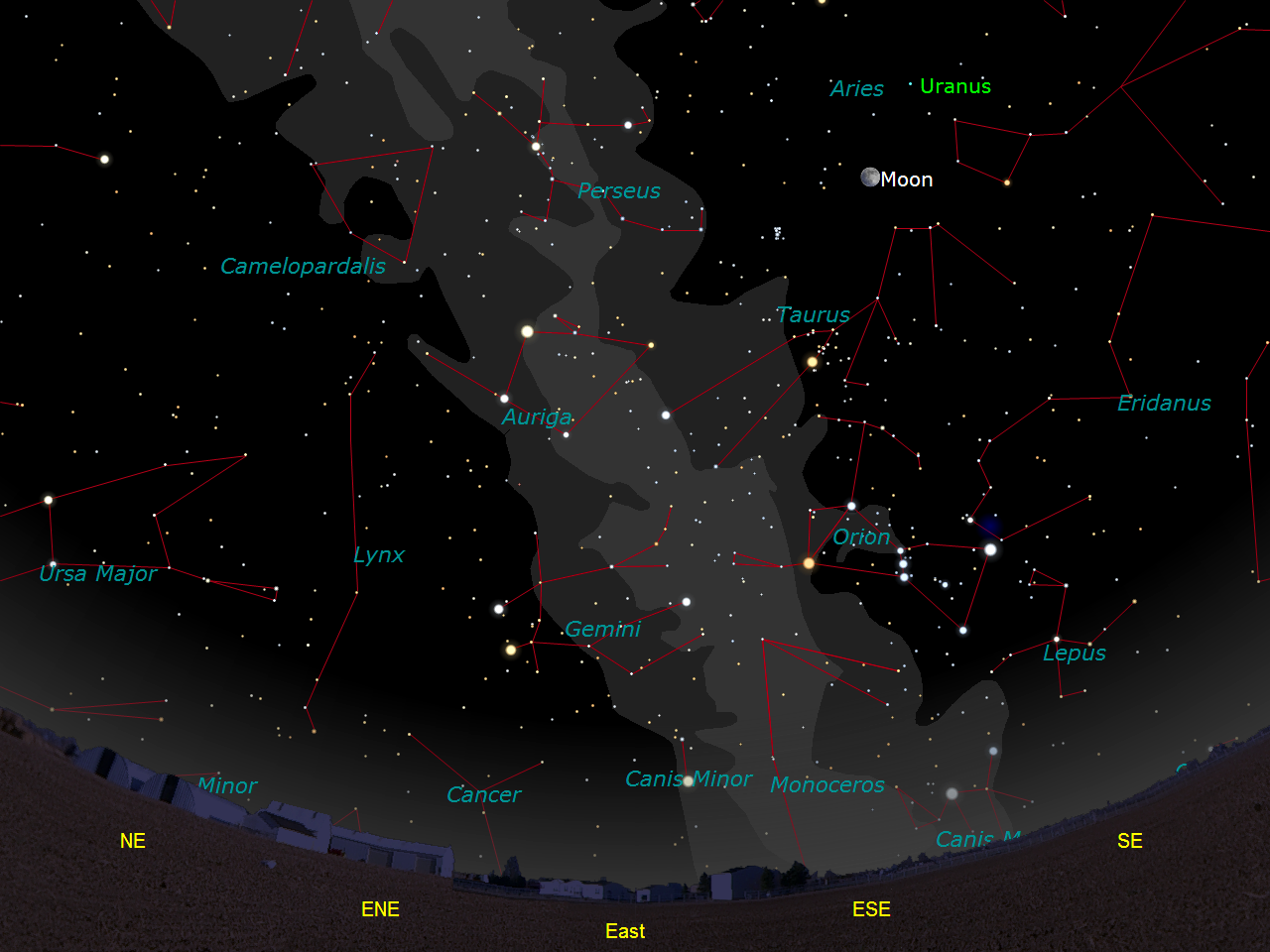 | Orion, “...throwing a leg up over our fence of mountains,” as Robert Frost once wrote, is easily visible by 9 p.m. Map by Gary A. Becker using Software Bisques's The Sky... |