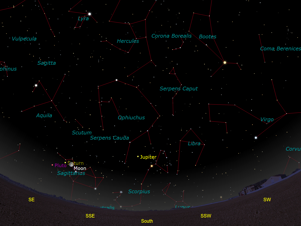 The two most massive planets of the solar system, Jupiter and Saturn, are now easily visible in the south (Jupiter) and southeast (Saturn) by 11 p.m. The only problem is that they are very low in the sky, positioned where the sun is near the winter solstice, so relatively good horizons are necessary if you want to observe them. However, outside of the presence of the moon in the sky, Jupiter reigns supreme in brightness, allowing it to be seen easily if buildings or trees are not hiding it. Recently, the media hyped incorrectly the “ease” of seeing with binoculars the four brightest satellites of Jupiter’s 79 moons, and indeed, at least two of them, Ganymede and Callisto, can be observed this way. They are the two outer moons of the four discovered by Galileo in 1609-10 and as a group are called the Galilean satellites. Ganymede is just a little larger than the planet Mercury while Callisto is just a little smaller. They are distinct worlds onto themselves. The problems with seeing these satellites through binoculars are the differences in brightness between Jupiter and its Galilean satellites, their closeness to Jove, obtaining a precise focus for each eye, and most importantly, holding the binoculars steady. Ideally, these satellites need to be at their greatest angular distances from Jupiter. See the box below. If you want to include the other two moons discovered by Galileo, Io and Europa, which are about the size of our moon, you’ll need a small telescope, but virtually any telescope will do. Spotting scopes will work too. Your longest focal length eyepiece, the one with the biggest number, will easily suffice and make it simpler to find the planet because the telescope’s magnification will be at its lowest and its field of view at its greatest. The extra steadiness that even a rickety tripod will create will hold Jupiter secure enough to see its four moons if they are positioned correctly. July 9th is an especially good evening to try your luck in viewing the four Galilean satellites with a small scope. On almost all clear evenings you will see at least three of the four satellites. If you’ve got the scope outside and working, you should also turn it to Saturn. Fainter than Jupiter, but still bright compared to the other stars, lower in the sky and to Jove’s left by about 30 degrees, a small telescope or spotting scope will have absolutely no problem in discerning Saturn’s beautiful rings which are currently tilted back by nearly their greatest amount. If you see a faint starlike object close to Saturn, it will probably be Titan, Saturn’s largest moon. The next few years will be good for watching the God of the Harvest, but gradually our view of Saturn will shift into the ring plane. The exceedingly thin debris field of frozen ice particles will become invisible from Earth, even through large professional telescopes. Next year at this time, Jupiter and Saturn will be only six degrees apart, while Jupiter will be a mere one degree, two lunar diameters, from Pluto. View Jupiter and Saturn now while the weather is still warm and balmy. You won’t regret taking the time to set up your scope and make these observations.