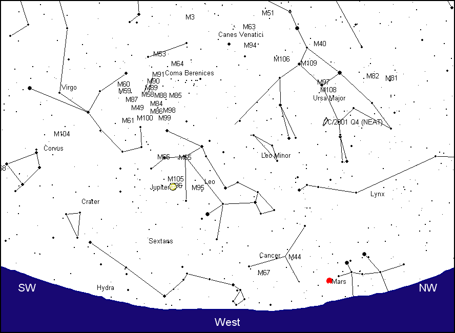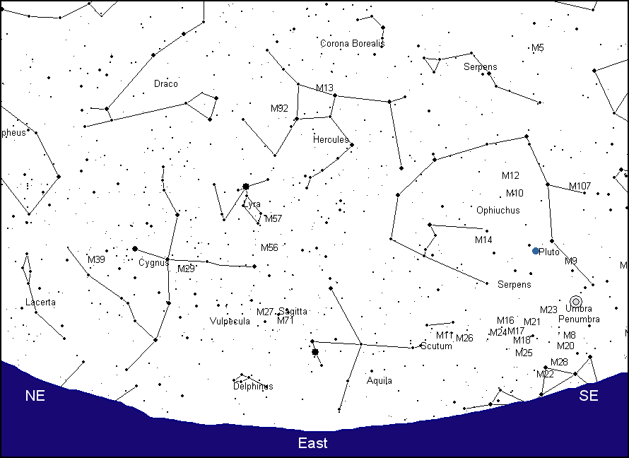 The Great Summer Triangle is a surefire indication that summer is upon us. Catch it low in the east at 10 p.m. If you are viewing from a rural location, expect to see the hazy star clouds of our Milky Way Galaxy also visible. |