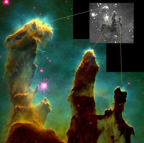Eagle Nebula--Pillars of Creatio--(M16): This is the famous Hubble Space Telescope photograph showing the Pillars of Creation. It is where stars are being born. The picture is considered to be one of the most beautiful astronomical photographs ever imaged. The black and white version of this picture (insert), taken with a small telescope, shows many of the major details shown in the Hubble image. These include the three pillars, their luminous tops, and the bridge of material which is emanating from the smallest pillar. The pillars themselves are dust clouds immersed in a glowing cloud of hydrogen gas. They are stellar nurseries. Imbedded within their tips are contracting clouds of hydrogen on their way to becoming stars. Radiation being released by new stars above and outside of the field of the picture, are shredding the tips of the pillars, revealing where stellar birth is occurring and causing the dust to be blown away creating the pillars. Eventually, the dust within each of the globules will be pushed away as the new stars emerge from their cocoons. Astronomers are uncertain whether the protostars will become stars or be shreaded along with the rest of the pillars. The Pillars of Creation is a more recent name given to the Eagle Nebula which is about 7000 light years away from us in the constellation of Serpents, the Snake. The black and white photo was taken by John Sefick at Chaco Observatory in Chaco Culture National Historical Park in northwestern New Mexico. |