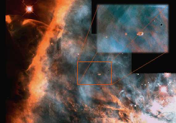 Deep within the Orion Nebula which can be found in the sword of Orion, the Hunter, is another stellar nursery. Look in the small rectangular box, and then follow it up to the bigger box. There you’ll see some dark blobs. These are called Proplyds, and are clouds of contracting gas and dust. Within these clouds stars are being born. When the new stars begin to change hydrogen into helium deep within their cores, the energy being released will push away the remaining gas and dust to reveal the new star. Hubble Space Telescope photos... |