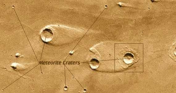 This picture shows a great deal of evidence that water flowed over the surface of Mars. The two large meteorite craters to the left were made by rocks hitting Mars from outer space. Then this region of Mars was flooded. The water flowed from left to right. This can be seen in the teardrop-shaped formations behind the three big craters. The water was carrying lots of debris (dirt) during the flood. When the water passed around the craters, its speed was slowed and it dropped its debris behind the craters. Later the smaller meteorite craters were made as well as the large crater in the box. The way the boxed crater appears, shows that there was water in the ground when the meteorite hit. The heat from the meteorite's impact melted the frozen water in the ground around the crater, causing the ground to flow. The crater walls also slumped or collapsed because the ground became too muddy to support the weight of the crater walls. |
