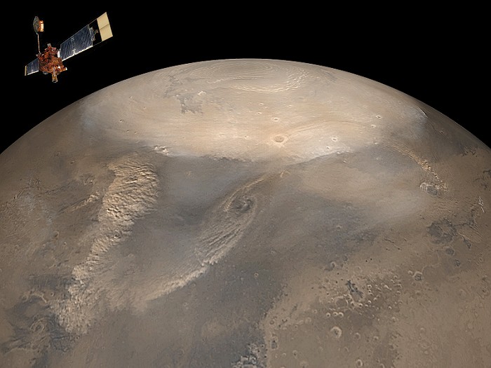 Spring on the North Polar Cap of Mars: This magnificent photograph of Mars’ North Polar Cap was taken in 2002 by the Mars Global Surveyor satellite (upper left corner of the picture). Like Earth, Mars has polar caps which are composed of water. Unlike Earth, Mars also has frozen carbon dioxide, or dry ice, on its polar caps. Notice the clouds south of the polar cap. Cold air coming from the polar cap mixes with the warmer air over the ground, which has been heated by the sun, to form storm systems similar to Earth. On Mars, however, no rain or snow comes down from the clouds, but it does get windy. |