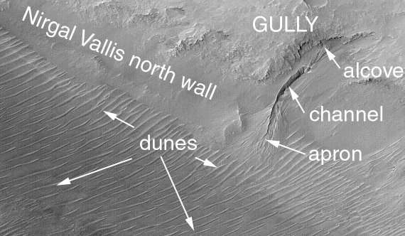 The Nirgal Valley on Mars has sand dunes which are all lined up. This shows that the Nirgal Valley has winds which are always blowing from the same direction. Also look at the channel. This was probably an area where water flowed into the valley, early in the history of Mars when conditions were warmer. |