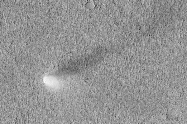 A dust devil, like a mini tornado moves across the surface of Mars. |